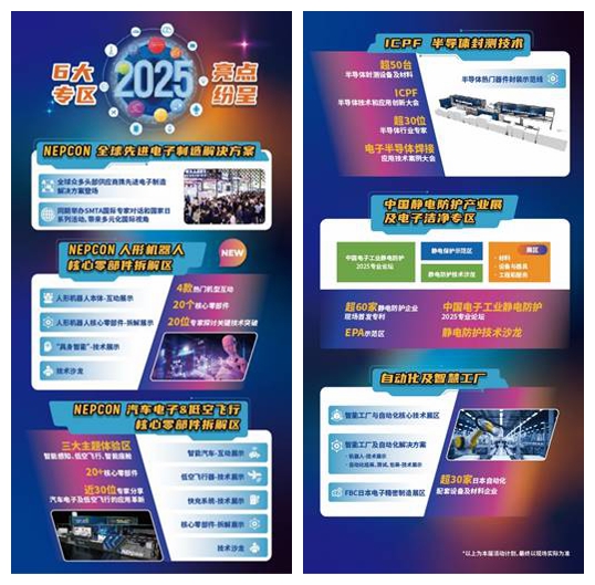 本届展会创新打造六大特色细分专区,NEPCON全球先进电子制造解决方案、NEPCON人形机器人核心零部件拆解区、NEPCON汽车电子&低空飞行核心零部件拆解区、ICPF半导体封测技术、中国静电防护产业展及电子洁净专区、自动化及智慧工厂,满足不同行业观众的寻新品、探趋势、拓人脉的商务需求,打造一场精彩绝伦的电子制造科技盛会。