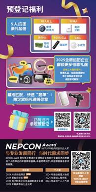 立即行动!电子人提前预登记组团,即可现场领取多重豪礼。还有NEPCON TAP买家专属定制服务+礼遇,立即扫码预登记,开启你的价值礼遇之旅,我们现场见!