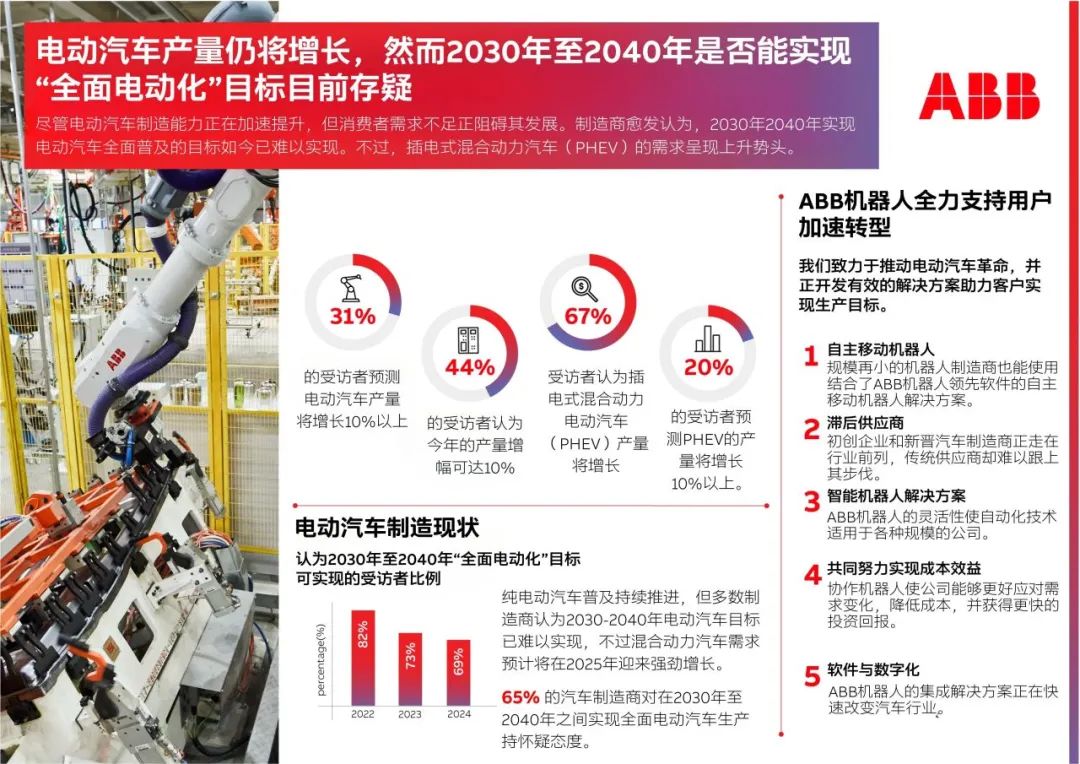 对信心下滑的进一步调查发现,目前主要障碍在于“工厂之外”,其中消费者需求不足和对充电基础设施的信心缺失为突出痛点。ABB汽车制造行业前景调查还显示,制造业专家预测2025年混合动力系统将强劲增长,67%的受访者认为插电式混合动力电动汽车(PHEV)产量将增长,20%的受访者预测产量将增长10%以上。混合动力电动汽车(HEV)的数据同样乐观,62%的受访者预计今年产量将增长。