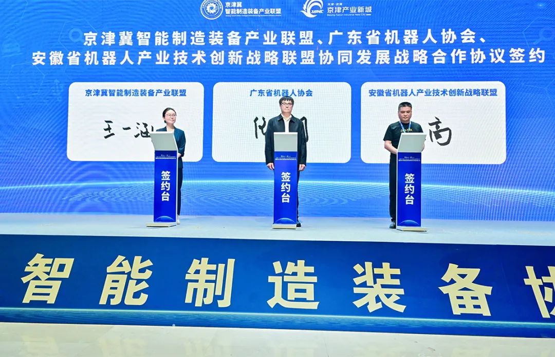京津冀智能制造装备产业联盟、广东省机器人协会、安徽省机器人产业技术创新战略联盟签订协同发展战略合作协议,进一步发挥行业组织桥梁纽带作用,强化区域联动,推动智能制造装备产业高质量发展。